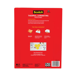 Scotch Laminating Pouches protect documents you handle frequently. They are for use with thermal laminators and create a permanent seal for long-term protection. Pouches are clear to let important information show through. Try other quality products from Scotch Brand for all your needs in the home and office.