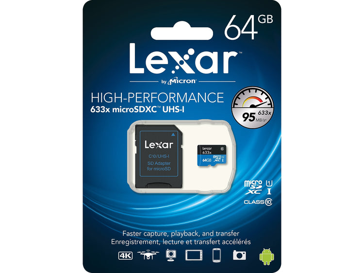 Designed for your smartphone, tablet, or action camera, Lexar High-Performance 633x microSDXC UHS-I card lets you quickly capture, playback, and transfer 1080p Full HD, 3D, and 4K video, as well as high-quality movies, photos, and songs. This high-capacity Class 10 card leverages UHS-I technology to deliver high-speed performance — up to 100MB/s (633x). The card also comes with an SD adapter for easy file transfer. This premium memory solution gives you the speed and space you need to capture more adventure on the go.