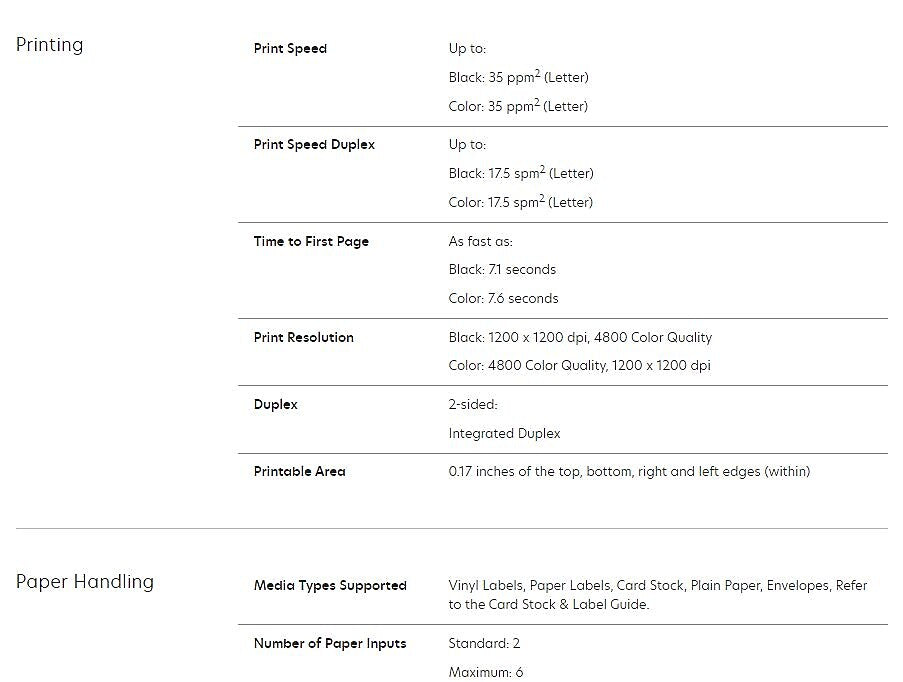 Maximum Print Speed (Black): 35 ppm; Maximum Print Speed (Color): 35 ppm; Print Resolution (Black) (Width x Height): 1200 dpi x 1200 dpi; Print Resolution (Color) (Width x Height): 1200 dpi x 1200 dpi.