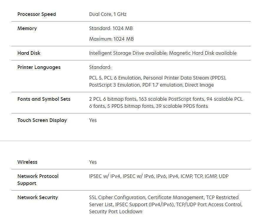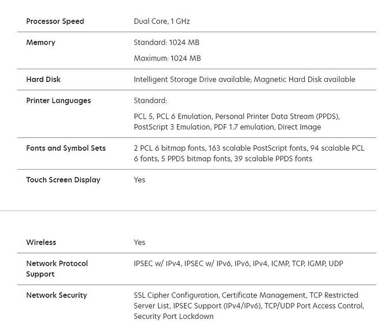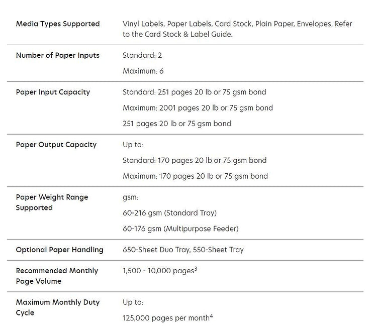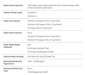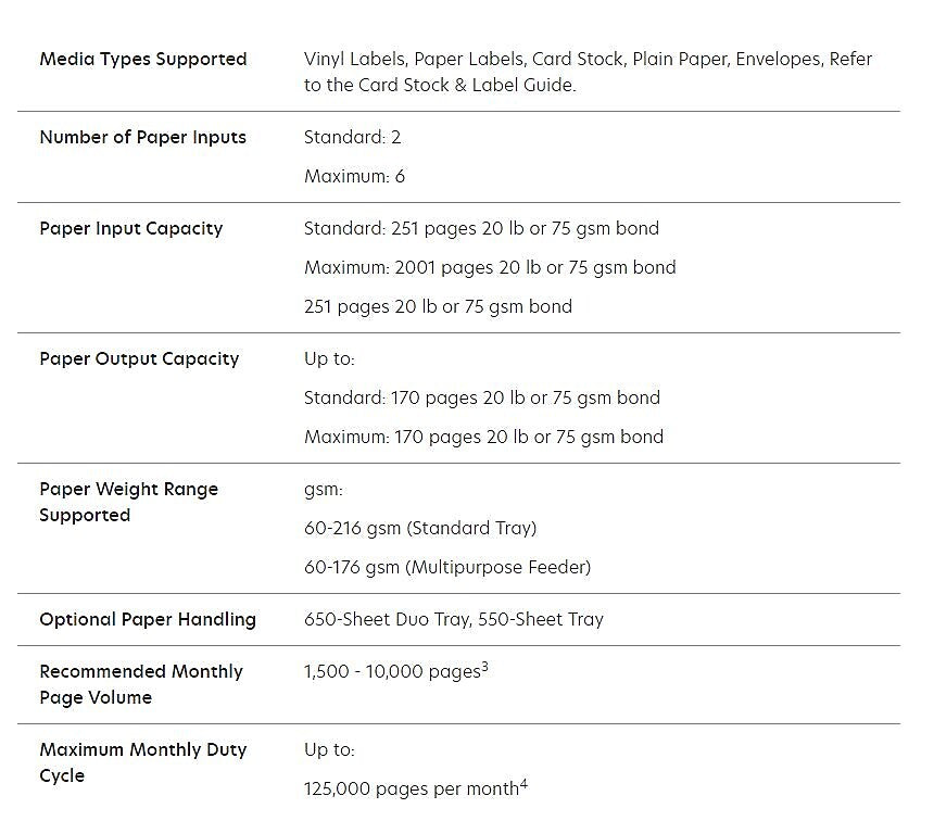 - Media Handling: 250-sheet input tray, 1-sheet manual tray