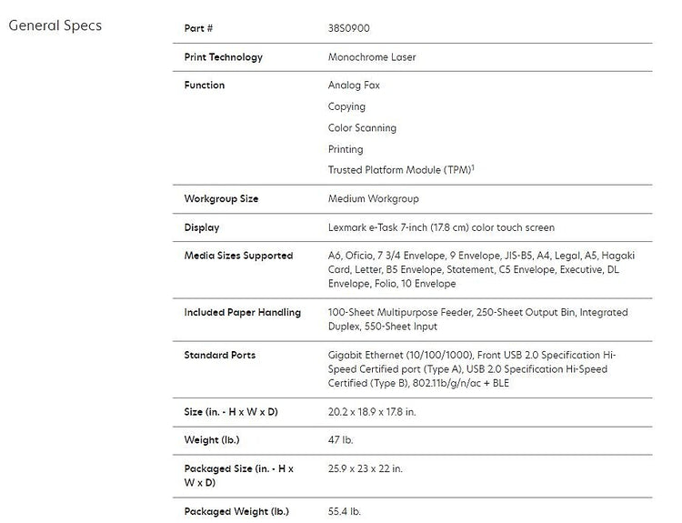Lexmark MX632adwe Multifunction Mono Laser Printer (38S0900)