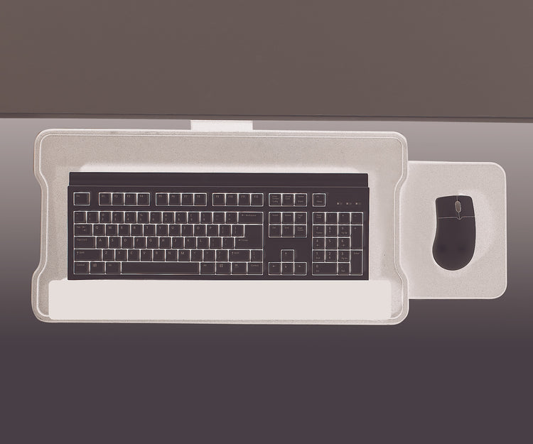 The LifeFlo Ergonomics 800-STD Keyboard Platform is an ergonomic keyboard tray made of MDF, and a non-skid vinyl coating. The platform is 22.75" x 10.5" x 1". The pull-out mouse tray slides left or right. The bolt on palm rest is .875" high. The Standard Mechanism is fully articulating and swivels 360°. Height adjusts 5 3/4", is 17" deep, and tilts 15°.