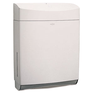 Dispenses C-fold or Multi-fold towels without adjustment or adapters. Cabinet slots indicate refill time. Door has concealed locking device to prevent tampering or theft. Made of durable ABS plastic for extended lifetime.