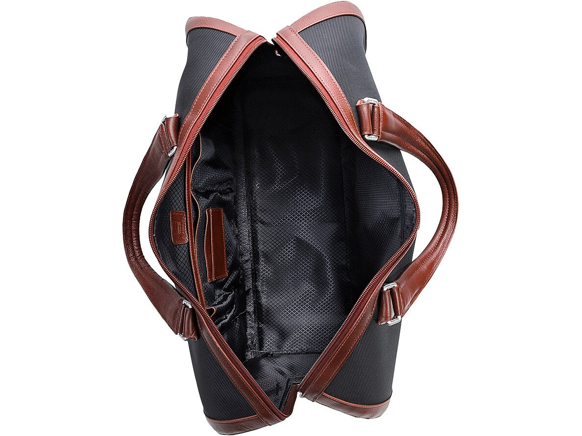 McKleinUSA U Series KINZIE spacious 20.5" carry-all nylon duffel bag with elegant contrasting leather accents. Opens easily with exterior pull tabs or the dual leather carrying handles. Its fully lined interior accented in leather trim and silver hardware make storage a dream with lockable zipper. Store everything you need for a weekend getaway in one convenient bag. Full-length zipper makes reaching the interior clothing, protected tablet pocket, and travel/business accessory organizer easy. Exterior back zipper pocket allows for easy access to your most needed items (cell phones, keys, etc.). Transport in comfort with this non-slip contour padded removable shoulder strap. And set this duffel bag down with confidence on five protective metal feet.