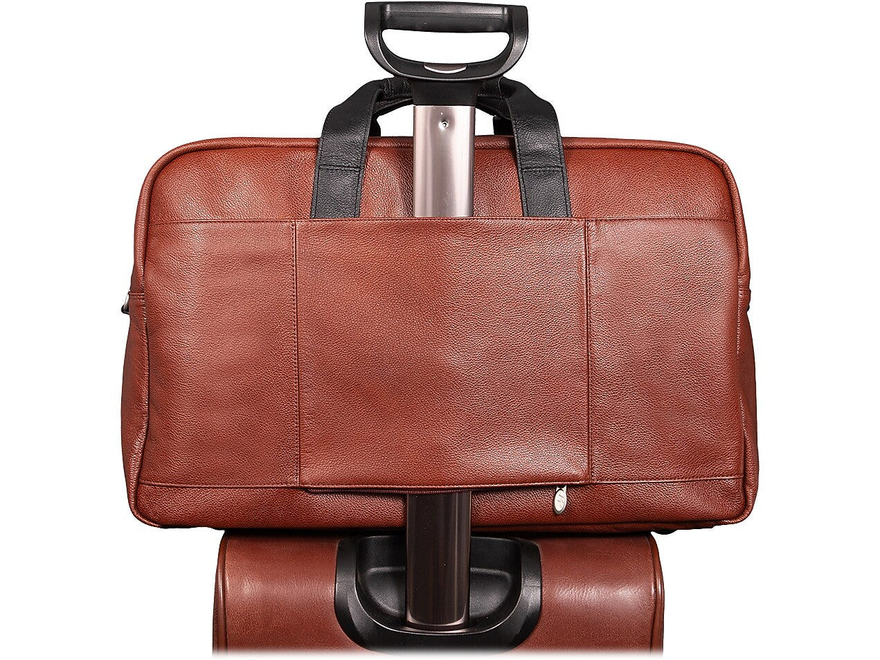 Amazingly spacious McKleinUSA U Series WELLINGTON dual-compartment carry-on duffle with elegant contrasting leather accents makes packing for important trips simple. Cellphones, keys, and other such items can be stored for easy access in the front zipper pocket with accessory organizer. Other necessary items can be stored in the front dual slip pockets. The fully lined interior with leather trim and silver hardware will keep all your valuable necessities stored safe with double anti-theft locking loop metal zippers. Clothes, files, papers, etc. can all be stored in the main compartment with enough room for a week. Keep your toiletries in the elastic pockets for simple storage. The back compartment can safely store your laptop and tablet in the secured built-in padded laptop sleeve and tablet pocket. Attach the included removable non-slip contour-padded shoulder strap, and sling the bag onto your shoulder. Unzip the back pocket to attach to any rolling case for comfortable transport, and set it down with confidence on five protective rubber feet.