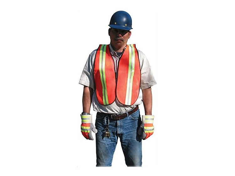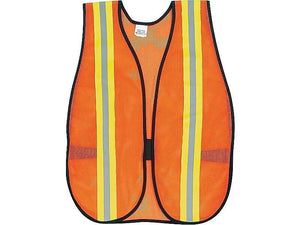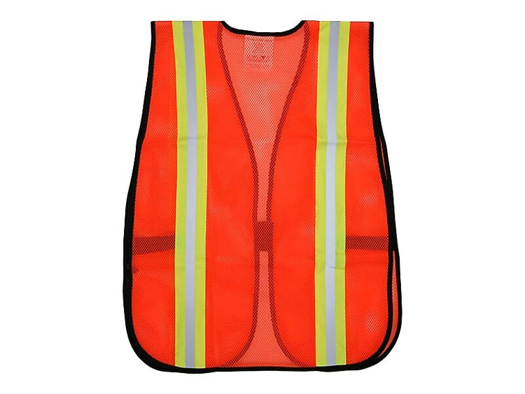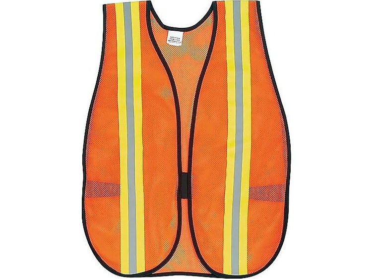 Ensure visibility to avoid injury with this orange safety vest. The mesh material is lightweight and cool during long hours outside or indoors, and 2-inch lime and silver reflective stripes highlight location when illuminated by headlights. The hook-and-loop tab front closure of this MCR safety vest is easily fastened and keeps the vest in place.