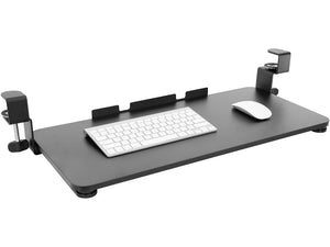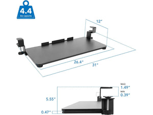 - EXTRA LARGE DESIGN: This clamp-on keyboard is extra wide, featuring 26.4” of platform space, able to easily accommodate your full size keyboard, mouse, and keeping your phone and office supplies within arms reach. PLEASE NOTE, THE TRAY REQUIRES 31 INCH WIDE INSTALLATION AREA TO ATTACH TO THE DESK.