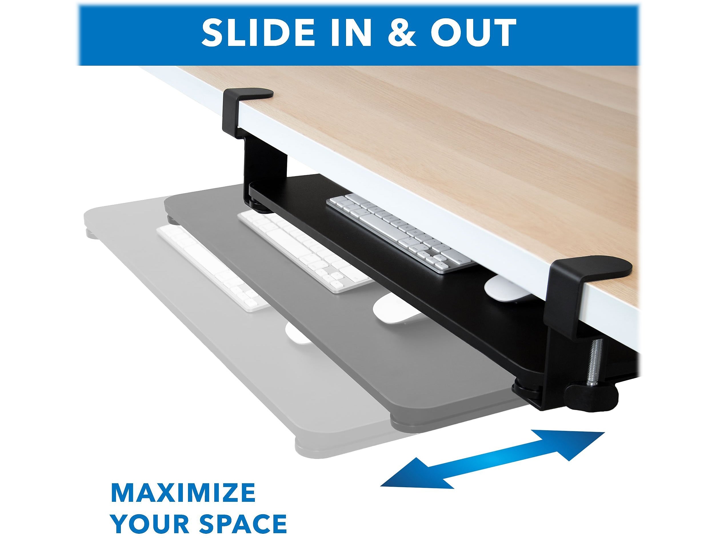 - FITS MOST DESKS: This clamp keyboard tray fits under most standard work desks and will provide added workroom for when you need it, and discreetly stores itself away for when you don't.