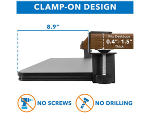 - SMOOTH MOTION TRAY: This keyboard tray clamps right onto the edge of your work station and provides a satisfying feeling of sliding in and out under your desk. Fits desks with 0.4 to 1.5 inches thick.