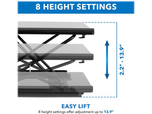- EASY HEIGHT ADJUSTMENT: Scissor lift mechanism comes with helper springs to gently lift your keyboard and mouse. Press the side lever to adjust height between 1.6" min to 15" max (5 preset levels of 8.5", 10.4", 12", 14.4", and 15.5" from the desktop).