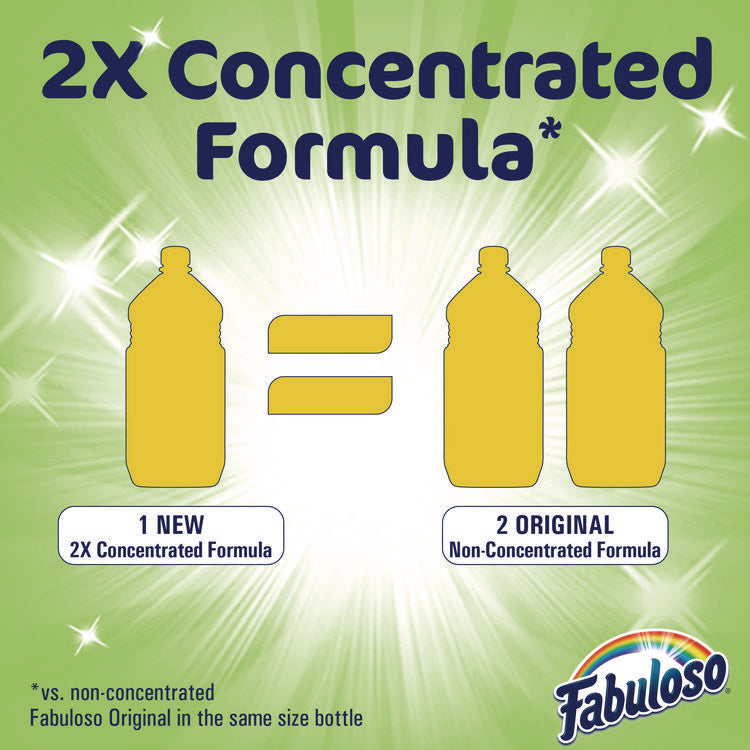 Fabuloso® Multi-Purpose Cleaner, 2X Concentrated Formula transforms your home or business with a fresh scent that lasts. Bring the fragrance of Fabuloso® indoors, and experience a warm, joyful feeling your friends and family will love. Fabuloso®'s 2X Concentrated Formula now provides 2x more active ingredients compared to non-concentrated Fabuloso Original, giving you 2x the dosage in the same bottle. Every colorful pour from the easy-pour bottle delivers a long-lasting, unmistakable freshness and leaves your home bright and clean. Use Fabuloso® Multi-Purpose Cleaner, on sinks, toilets, tubs, showers, kitchen and bathroom floors, sealed wood surfaces, appliances, counters, windows, mirrors, walls, doorknobs and furniture, and fill every room in your home with joy.