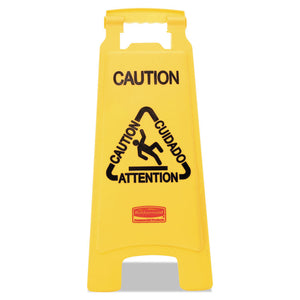 The Rubbermaid Commercial 2-Sided Caution Safety Sign is lightweight and versatile. The caution sign features the universal wet floor symbol and the word "caution" imprinted in English, French and Spanish for effective communication to broad audiences. The 25-inch model is suitable for use in a variety of locations, including narrow areas. The folding design allows for convenient storage or transport on a janitor cart. Each of the safety signs features durable plastic construction that will not rust, corrode, or fade. The 2-sided, bright yellow design meets OSHA requirements. ANSI compliant multi-lingual graphics warn of a nearby hazardous area. The flexible locking-style hanger makes the sign stationary and easily visible from all directions. Measures 12" deep when open.
