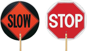 - With red and white "Stop" sign on one side and orange "Slow" sign on other side