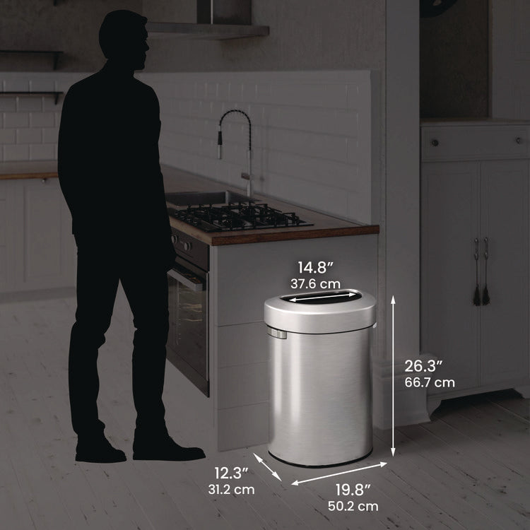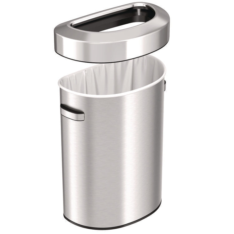 Open Top Trash Can, Half-Round, 18 gal, Plastic/Stainless Steel, Silver