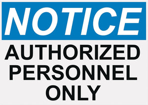 Safety sign with "NOTICE AUTHORIZED PERSONNEL ONLY" message. UV, chemical, abrasion, and moisture resistant.