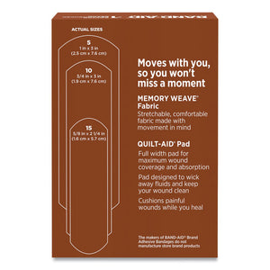 Band-Aid Brand Ourtone Flexible Fabric Adhesive Bandages in assorted sizes provide a wound care option in shades for brown skin tones. Designed to blend in with your skin tone, these fabric bandages are made with memory weave fabric to cover and protect minor wounds, cuts and scrapes by stretching, bending, and flexing with your skin as you move. From the #1 doctor recommended bandage brand, the flexible bandages protect against dirt and germs for up to 24 hours to help with your healing wounds. Each bandage features a Quilt-Aid pad for complete coverage that won't stick to the wound as it wicks away blood and fluids, allowing for gentle removal. Apply the sterile adhesive bandage to clean, dry skin for minor wound care and change daily, when wet, or as needed. Launching a range of bandages in shades for brown skin tones, Band-Aid Brand Ourtone Adhesive Bandages embrace the beauty of diverse skin.