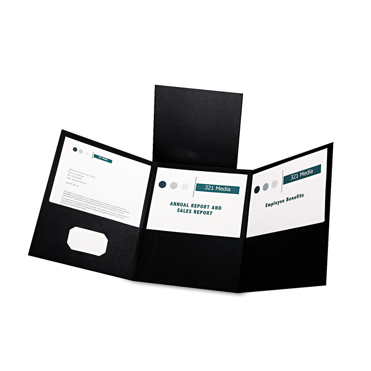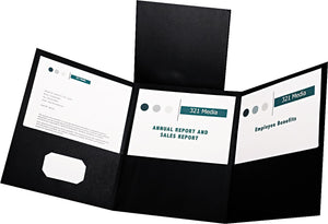 - Tri-fold pocket folder helps you manage multiple projects and keeps all your important papers in one place. Three interior pockets hold up to 150 sheets. Die-cut business card slot.