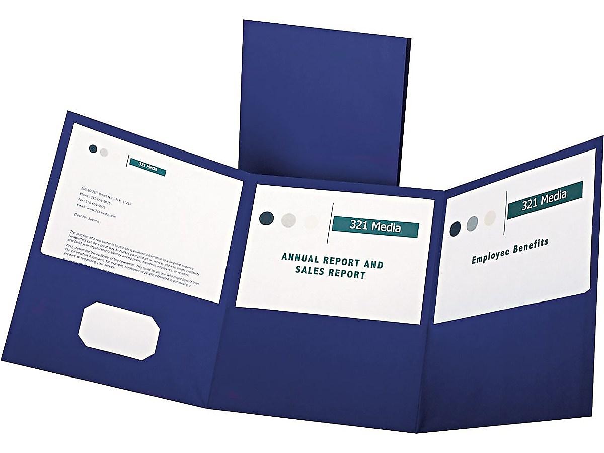 View Details- Presentation folders are made of blue paper stock for a professional appearance