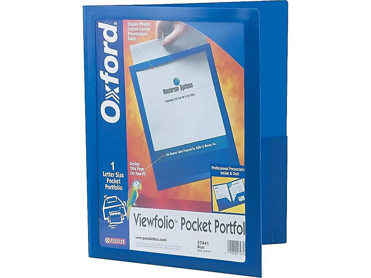 Keep papers neatly organized in this twin-pocket portfolio folder. The framed front cover lets you present the folder with a photograph, a title page, or other insert, and the waterproof polypropylene construction resists bending and tearing. This Oxford Viewfolio folder has two interior pockets for holding documents, as well as a business card holder for easy customization.