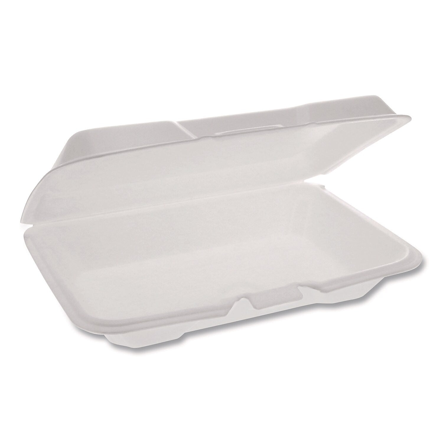 Pactiv Evergreen foam hinged lid containers are a reliable choice for delivery, takeout, and curbside pickup. They're a great economical option that works well for cold salads and hot entrees. Good for delivery and takeout, these foam food containers are durable and stackable. These foam takeout containers are insulated to keep hot foods hot and cold foods cold.