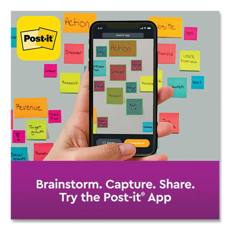 Experience the power of 2X stickiness and add joy to your day with the celebrated rainbow hues of the Playful Primaries collection. Super Sticky Notes stick to practically everything, everywhere! Revolutionary technology ensures your notes will stick securely to most surfaces yet remove cleanly! Versatile and essential, they're the perfect solution for lists, reminders, color-coding, labeling, brainstorming, storyboarding and even mural art. As they adhere firmly to walls, windows, doors, worksurfaces, mirrors and more, you can stick and restick them wherever they're most likely to be noticed. To enhance your note-taking experience, download the free Post-it® App to your smartphone or tablet and instantly capture, save and share your important notes.