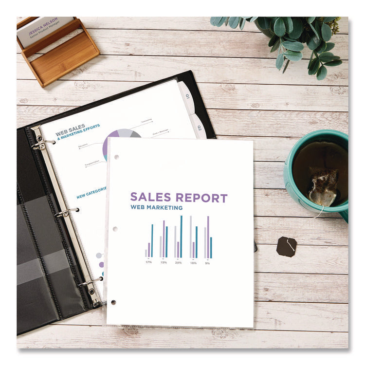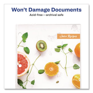 Protect your papers without obstructing your tab dividers. These Page Size Sheet Protectors offer sturdy protection of your three-hole punched pages without an extended binding edge that makes tabs hard to find. Durable material withstands the rigors of use in a three-ring binder while allowing you to view your pages with diamond clarity. The acid-free and archival-safe material keeps your pages in top condition and won't lift print from papers. With these sheet protectors, your pages will have the lasting protection they need.