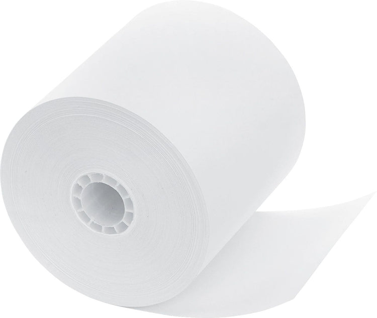 PM Company Impact bond cash register/POS paper roll in white color measures 3 1/4" x 240' and provides crisp, clear images with end of roll indicator. Paper is ideal for use with pos cash register, adding machine and more, sold as 5 roll per pack.