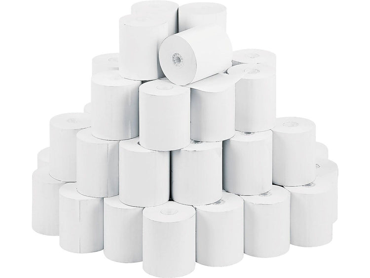 Stock up registers, credit card machines and most other transaction printers with this box of 50 paper rolls. The white color lets inks and toners stand out sharply, making it easy to read past sales. These PM Company direct thermal-printing cash register/POS paper rolls have a design that allows for both sides to be printed on simultaneously when using a two-sided printer.