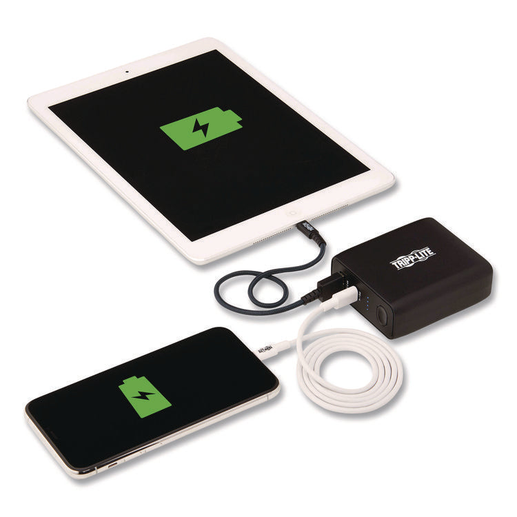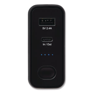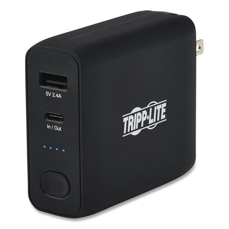 Small and lightweight, this high-capacity power bank dishes out 5,000 mAh of battery capacity for charging two mobile devices at the same time, including smartphones, tablets, e-readers, AirPods and handheld gaming devices. Lithium-ion lasts longer than lead-acid batteries, charges faster and saves you money in the end. Status LEDs let you know how much battery capacity is left. Portable power bank you can take with you to charge your devices at work, on the train, at a convention or at the airport. But it also features a NEMA 1-15P plug that connects to any standard power outlet. Plugging the power bank into an AC outlet turns it into an efficient wall charger that not only charges its own battery to full capacity, but charges up to two connected mobile devices as well. A USB-A port and a USB-C port provide a total of 5 V 2.4 A (when connected to an AC outlet) or 5 V 3 A (DC power) to charge your devices, including Android, Apple and Windows. Comprehensive safety features ensure worry-free charging of mobile devices. The power bank provides short circuit, over-voltage, over-current, over-charge and over-discharge protection. An ideal power solution when you're on the road or stuck somewhere without convenient electricity, the portable battery charger fits comfortably in your purse, pocket or backpack to keep your phone, tablet, Kindle, AirPods or other mobile device operating when you need it. The NEMA 1-15P plug folds into the unit when not in use to shield it from damage and prevent it from snagging or scratching your bag's contents.