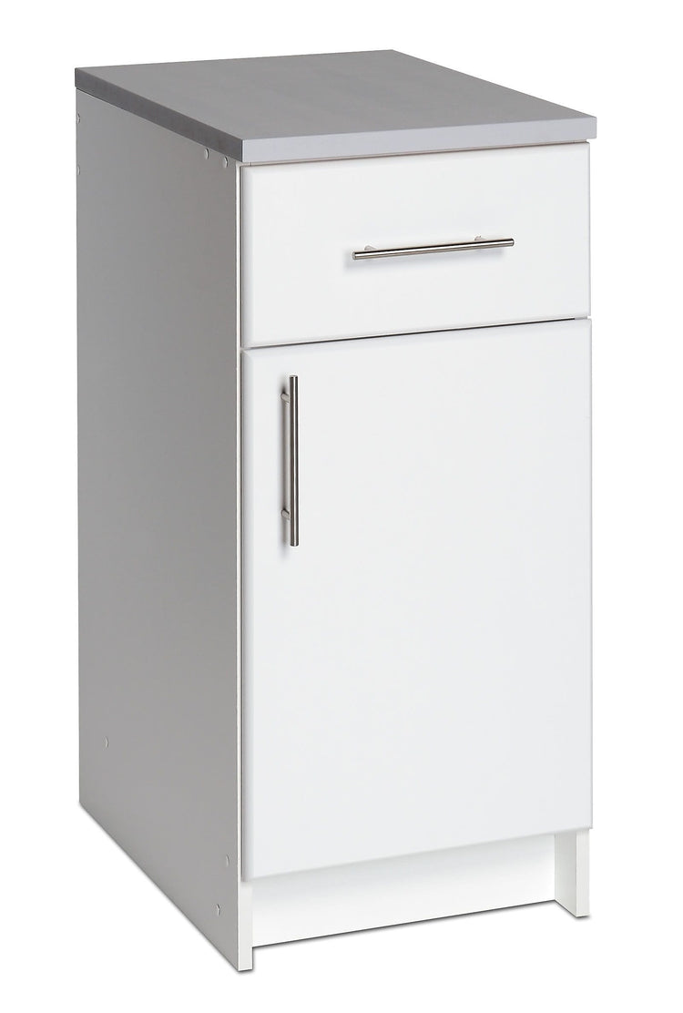 Prepac™ Elite 16" base cabinet is constructed from CARB-compliant laminated composite woods. Cabinet has durable fresh white laminate finish with 1" thick worktop with a durable melamine surface.