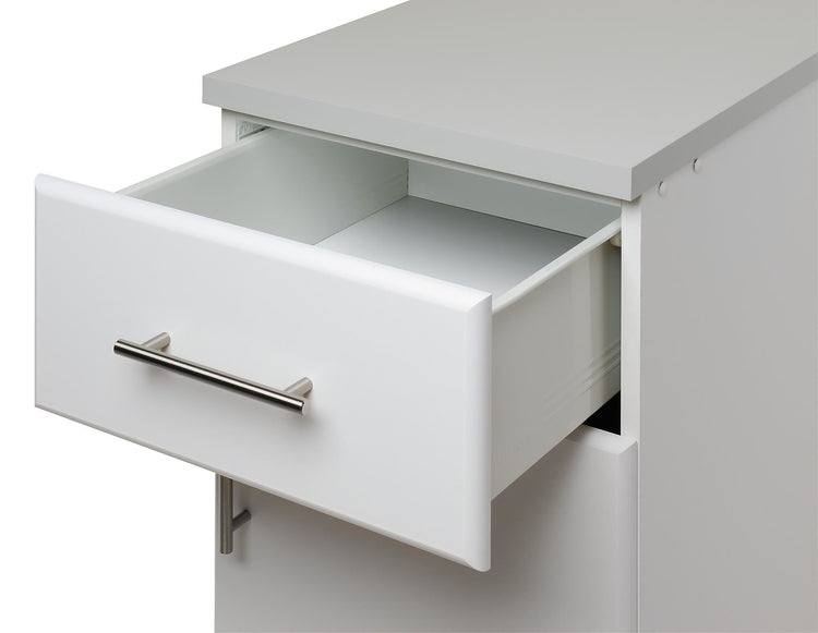 - 1" thick worktop with a durable melamine surface, stylish brushed metal handles, heavy duty drawer with metal sides