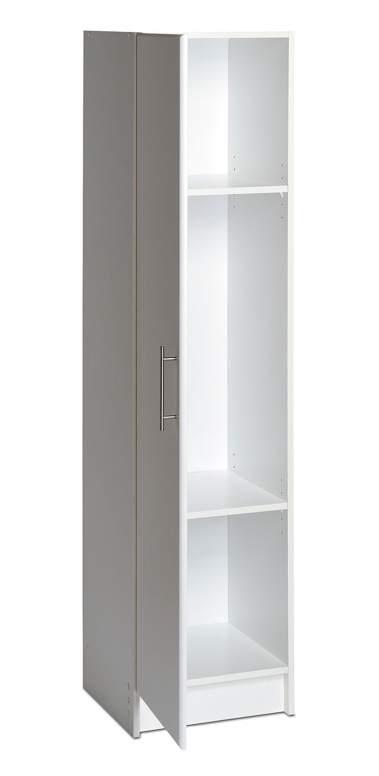 Prepac™ Elite 16" broom cabinet has 6-way hinges can be mounted to open left or right and is a tall closet for convenient and customizable storage. Cabinet features MDF body with white laminate and solid metal hardware for added durability.