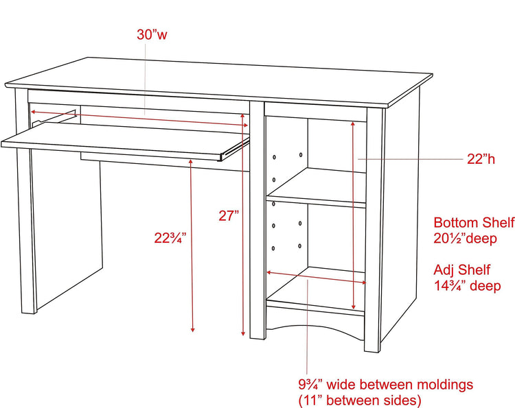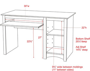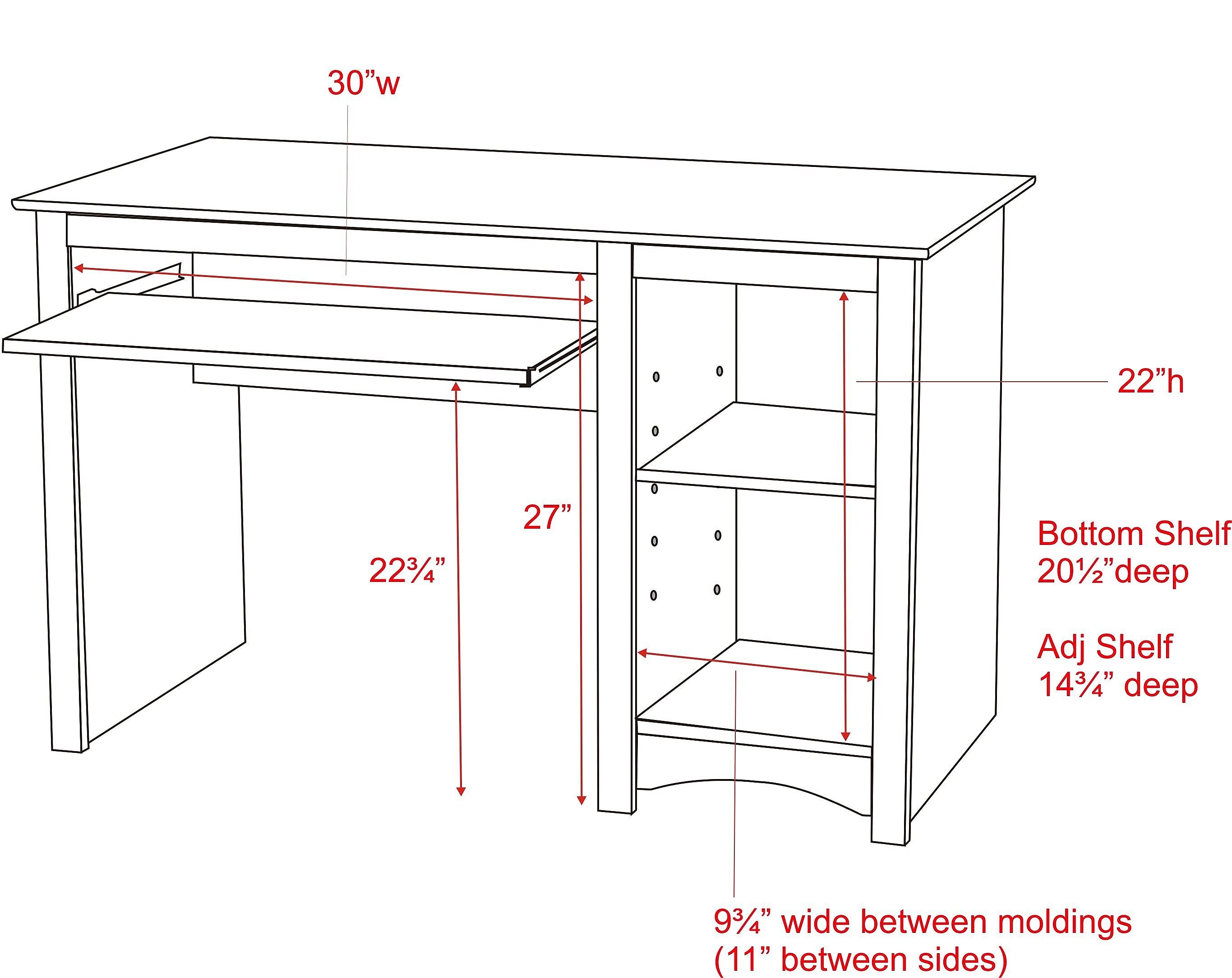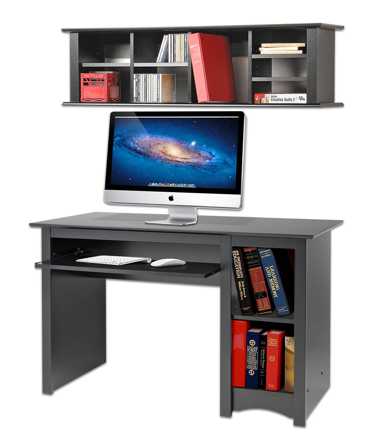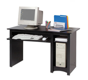 The Prepac Computer Desk offers storage and desktop space with a small footprint. The pullout tray saves space on the desktop while providing convenient access to devices like a keyboard and mouse. Designed to be positioned against a wall, the desk is constructed from real wood and black-laminated finish to complement almost any decor. The right-side shelves offer adjustable storage.