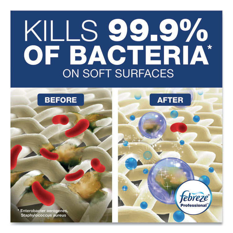 Soft surfaces that can't be washed, such as mattresses and upholstered furniture, are harbors for harmful bacteria, mold and mildew. Febreze Professional Sanitizing Fabric Refresher gives you the same freshening power of Febreze plus the soft surface sanitization your environment needs. Proprietary technology goes to the source of odors and fights them. A light, fresh scent is left behind to leave the treated area smelling fresh and clean. Safe for virtually all fabrics. Spray soft surface until fully wet and the soft surface must remain wet for five minutes.