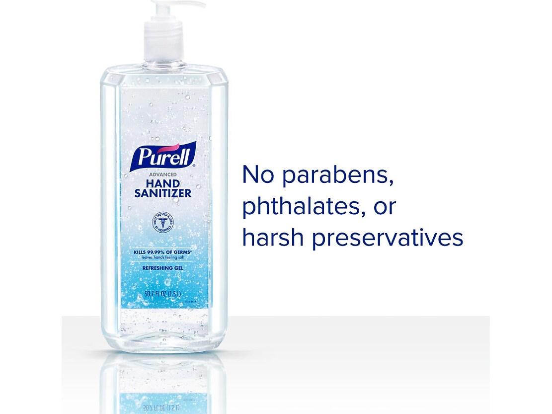 Show you care about well-being with PURELL® Advanced Hand Sanitizer Refreshing Gel. Because it’s America's no. 1 brand of hand sanitizer, this formulation can positively impact your image. It encourages people to sanitize their hands; in fact, 84% of people expect hand sanitizer to be offered in public places. PURELL® Advanced Hand Sanitizer is proven to kill 99.99 percent of most common germs that may cause illness. While it's tough on germs, the formulation is gentle on skin. With a blend of four skin conditioners, hands feel soft, even with frequent use. It's free of parabens, phthalates, preservatives, and harsh ingredients.