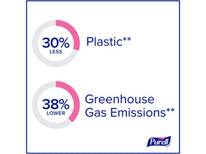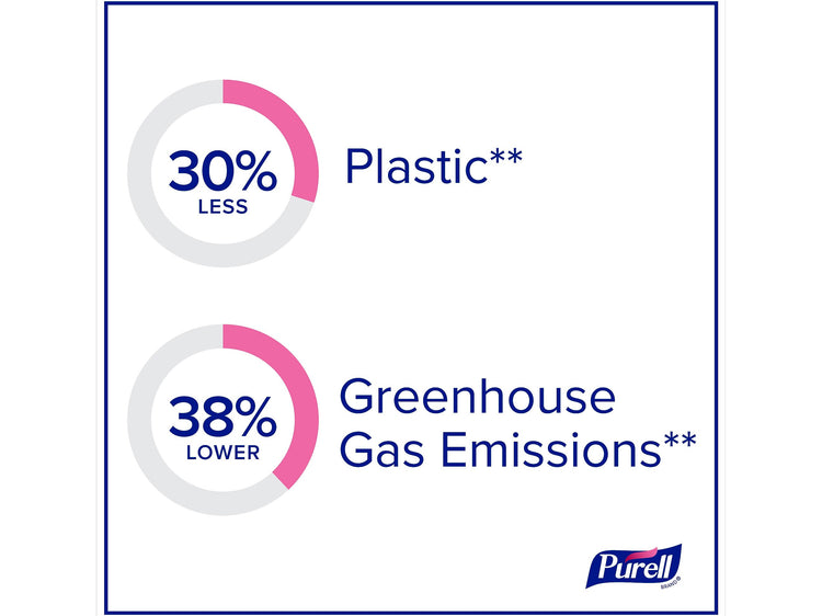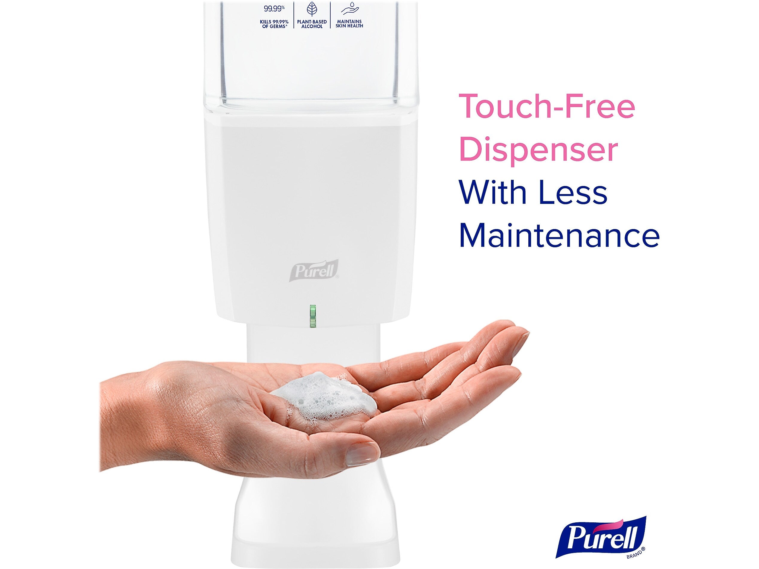 Purell ES10 automatic hand sanitizer dispenser requires less maintenance thanks to a fresh battery built into every refill, so you never have to change or buy batteries. Transparent refills make it easy to check product levels without opening the dispenser. Each refill has 30% less plastic and 38% lower greenhouse gas emissions for less waste. The refill bottle, collar, and AA battery are easy to pull apart and recycle. Its slim profile fits in tight spaces, and it quietly dispenses highly effective, rich foam hand sanitizer, delivering more ways to impress.