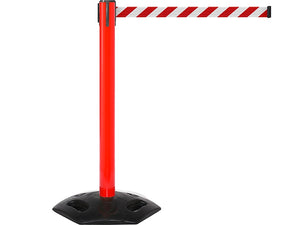 - Manufactured from double powder-coated stainless steel post in red with a tough recycled rubber base, fitted with a red/white diagonal striped nylon belt