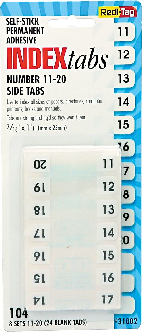 Redi-Tag® 11 - 20 Preprinted number tab in white color comes with self sticking feature and allows you to turn any size page into an index divider. Durable tab is preprinted that helps to create your own dividers, sold as 104 per pack.