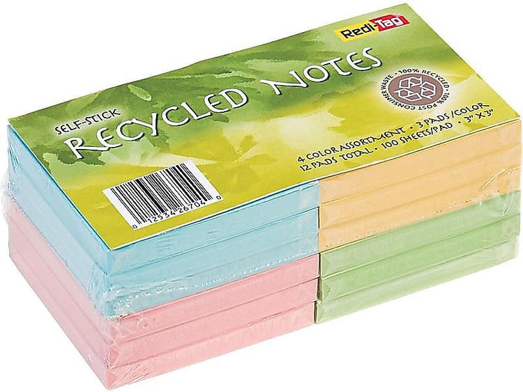 Redi-Tag Recycled Notes, 3" x 3", Pink, Green, Blue, Yellow, 100 Sheet/Pad, 12 Pads/Pack (26704)