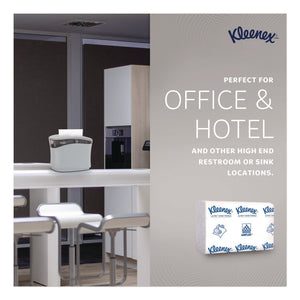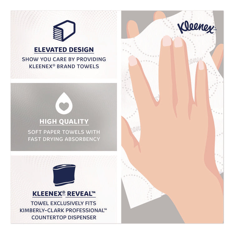 Using Kleenex Reveal Hand Towels with the Kleenex Reveal Countertop System offers your restroom guests an upgraded hand drying experience. Visitors take a towel without taking a step, so you can say goodbye to water splashes and sprays on floors and countertops. You'll say hello to a solution that elevates the cleanliness and image of your facility by dispensing superior Kleenex Hand Towels. The white towels are embossed with the trusted Kleenex logo and offer a balance of softness and strength to dry hands thoroughly. These towels dispense one at a time, so you only touch the towel you use. Throw away those germs and you'll enjoy peace of mind when it comes to the hygiene of your staff and your guests.