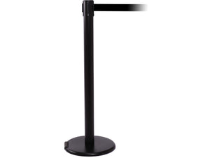 RollerPro 250 Black rolling retractable belt barrier is made of 0.055 ga durable steel/stainless steel with cast iron base for stability. Belt barrier measuring 40" x 2 1/2" Dia has 11' heavy-duty woven nylon Black belt for safety.