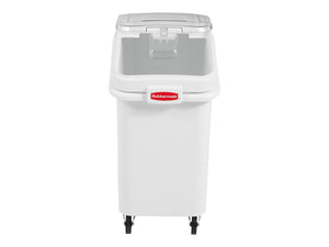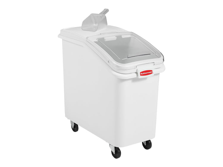 Access flour, sugar and grain quickly with this Rubbermaid ingredient bin. The clear sliding lid on this bin lets employees swiftly identify and fetch recipe elements with one hand, saving time and movement in busy kitchens. The storage bin's rectangular shape and four casters make it easy to move under prep tables or into storage rooms. This 26.2 gallon Rubbermaid ingredient bin has a built-in scoop storage facility to meet food code regulations.
