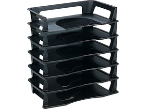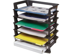 Sort important letter- and A4-size documents and folders in this set of black letter trays. These plastic trays snap together, which lets users create different configurations using three sets of two trays, two sets of three trays, or one set of six trays. These Rubbermaid Regeneration stackable side-loading letter-size trays contain 25 percent recycled post-consumer plastic.
