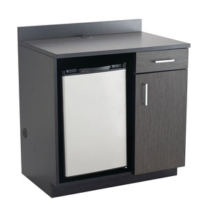 Modular, multiuse base storage cabinet for custom storage in workspaces, breakrooms and classrooms. Cabinet comes with 1 small task drawer, 1 cupboard, and an open storage compartment. Cabinet panels constructed from ¾" thick TFM laminate that is heat, moisture, stain and abrasion resistant. Drawers feature soft, self-closing mechanisms. Cabinet interior, side panels, backsplash and PVC edgebanding are Black with Asian Night finish cabinet exterior and countertop. Ships Ready-to-Assemble.