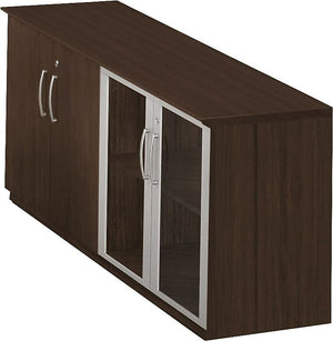 Features clean lines, curved shapes and floating worksurfaces. Provides an affordable, yet elegant curve on office furniture. Sets of doors lock separately that are keyed alike – also includes one adjustable shelf on each side. Perfect for extra storage. Featuring a combination of both Wood and Glass doors. Five standard finishes ensure a beautiful collaboration with other Medina furniture and complement most any décor. Ships in two boxes. Coordinates seamlessly with Medina Conference and Reception for a cohesive look.
