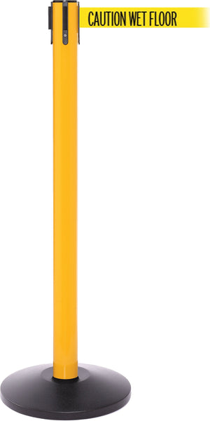 SafetyPro 250 "CAUTION-WET FLOOR" Yellow retractable belt barrier is made of 0.055 ga durable steel/stainless steel with cast iron base for stability. Belt barrier with 11' yellow/black is ideal for restricting access to work or cleaning areas.