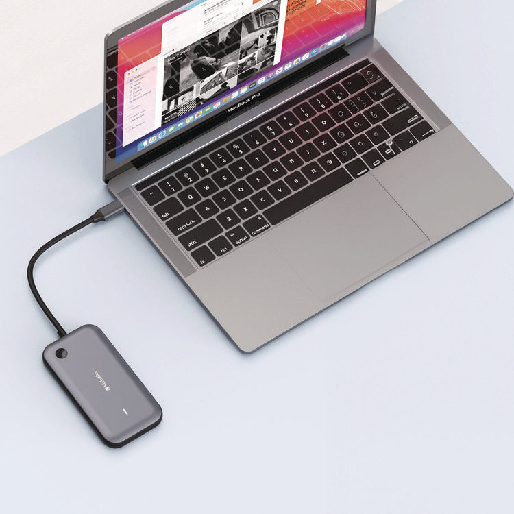 - Built-in hub with two USB-A ports and SD/microSD slots.