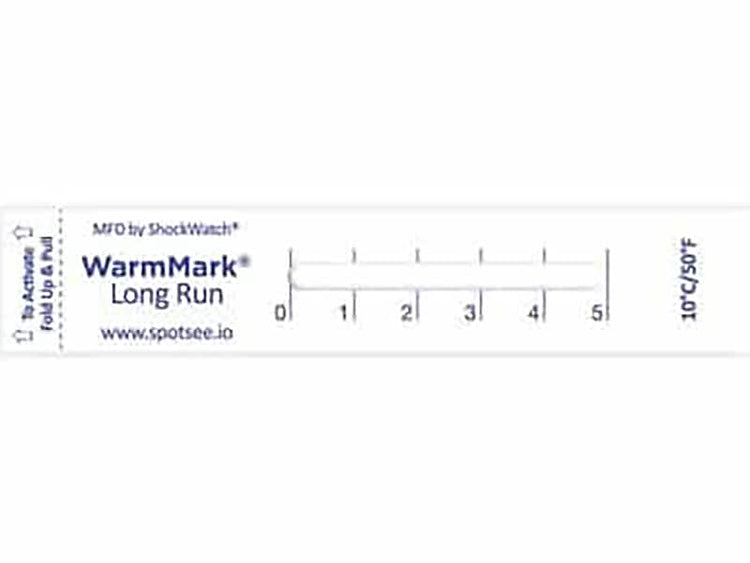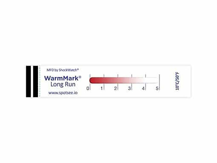 The ShockWatch WarmMark long-run temperature indicator is a cost-effective, disposable indicator that monitors temperatures during transport and storage, indicating whether goods have been subjected to unacceptable conditions. Affixed directly to your products or their packaging, this reliable temperature indicator provides visual evidence of exposure to unacceptable temperature levels, allowing you to determine if product quality has been compromised. Use of the ShockWatch WarmMark long-run indicator can have a positive effect on your bottom line because it indicates long-term exposure of the product to temperature excursions. If the window of the ShockWatch WarmMark long-run indicator stays white, there's no problem. But if the temperature climbs beyond a specific threshold, a red dye moves through the windows of the indicator with the passage of time. If the temperature returns to below the threshold, the dye stops its progression. In this way, handlers and shippers can know for how long the product has been exposed to temperatures above the threshold.