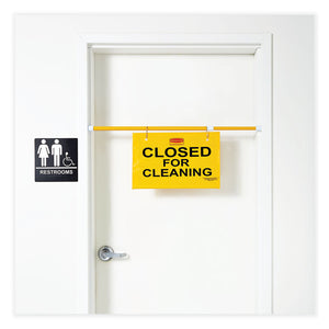 The Rubbermaid Commercial Hanging Safety Sign, "Closed for Cleaning" is mounted on a twist-action pole that extends up to 50" wide to prevent entry through even wide hospital doors. This safety sign is made of a soft, pliable material that rolls around the pole for easy storage when not in use. The color is both ANSI and OSHA-compliant.