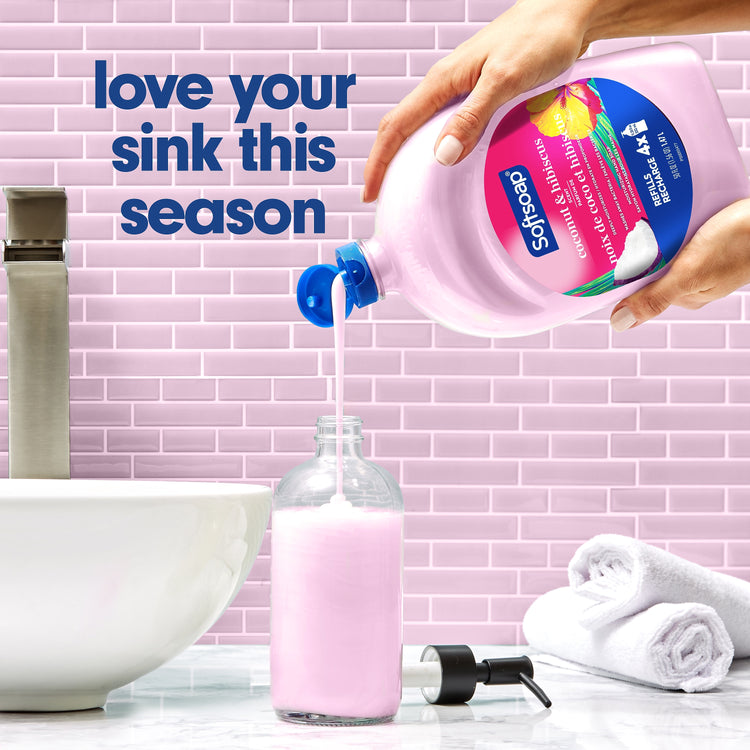 This Softsoap moisturizing liquid hand soap refill with coconut and hibiscus scent is an economical alternative to bar soap. It hydrates skin and leaves hands clean.